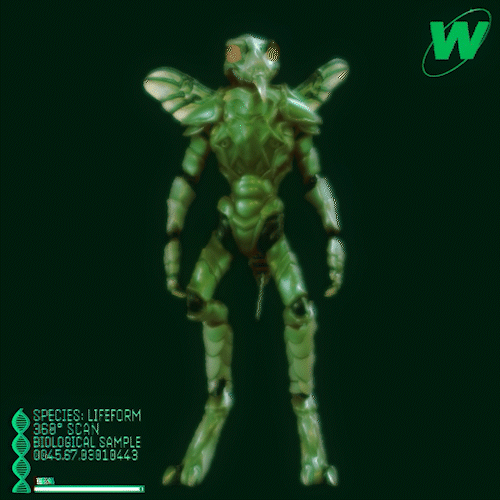 Mantix have a thick exo-skeleton, typically colored in swirls of warm green pigments meant to camouflage them against the dense jungles of Kørt. A large hollow tube-like stinger is located in the Mantix’s tail, this appendage pierces deep into the flesh of their prey and removes blood for ingestion.
